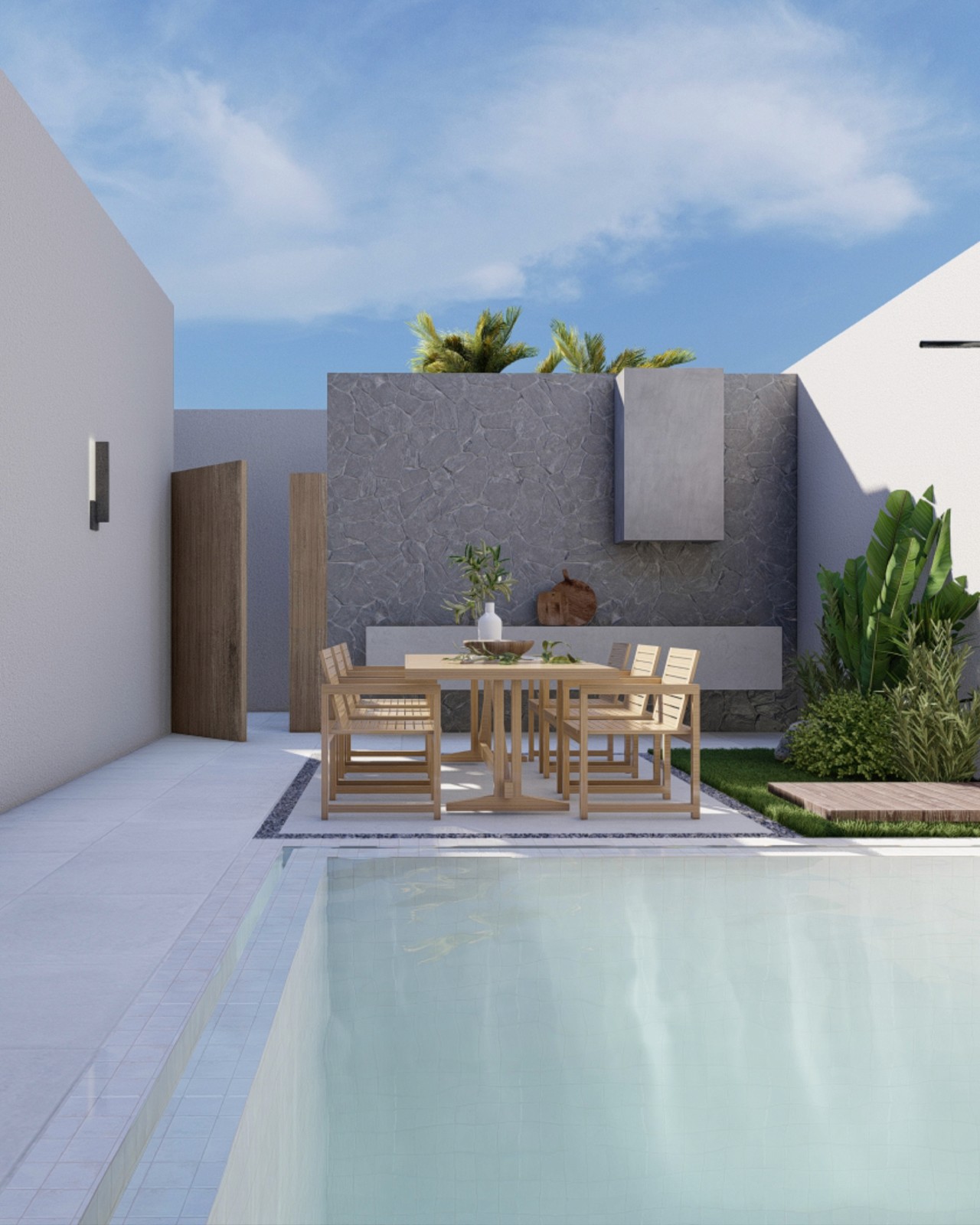 At ground level, the home extends into a carefully designed outdoor environment that includes a swimming pool, a fully equipped BBQ kitchen, a dining area, and multiple seating spaces—creating a relaxed, functional setting for coastal living. Together, these elements unite the refined geometry with a vibrant outdoor lifestyle, resulting in a contemporary beach house that is both simple and richly connected to its surroundings.