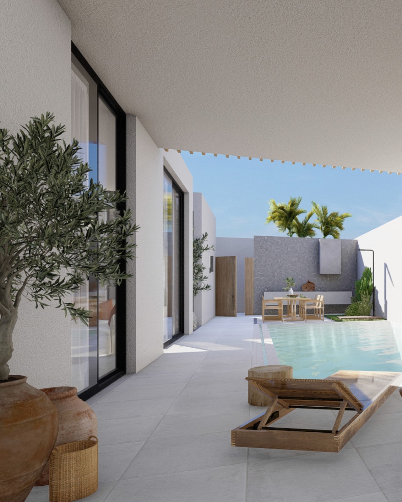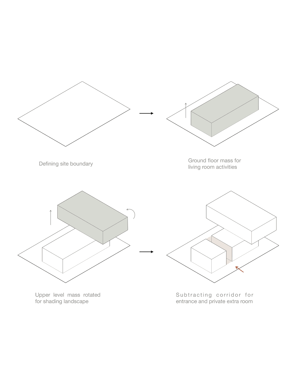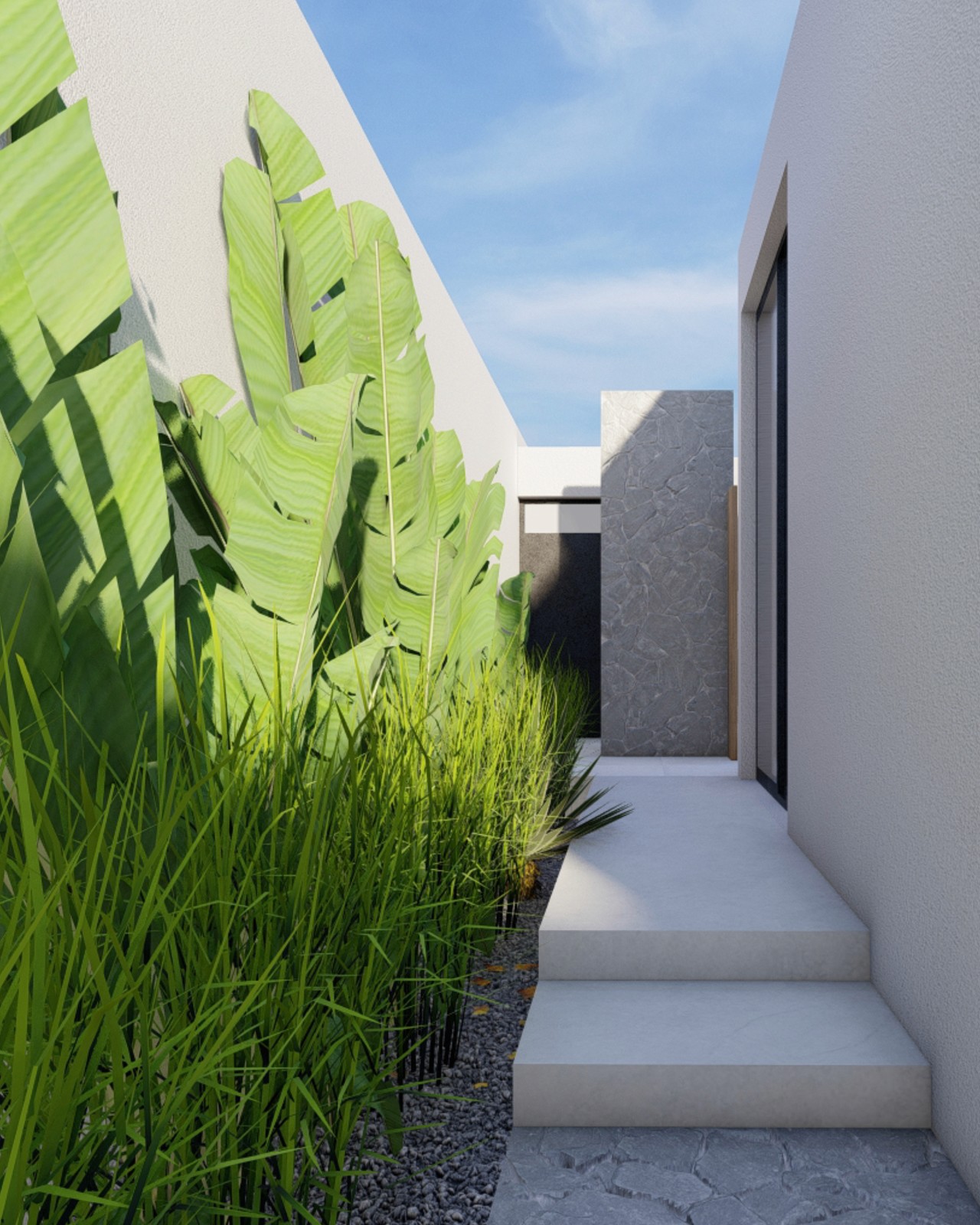 This project is shaped by clean, modern geometry, using two strong volumes arranged in opposite directions to create shaded outdoor areas and a distinctive architectural identity. The lower mass is divided to provide privacy for two separate living zones, while a slim landscaped corridor between them introduces greenery and discreet side entrances that enhance circulation and comfort.