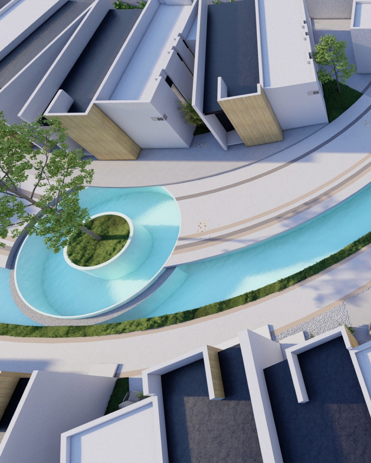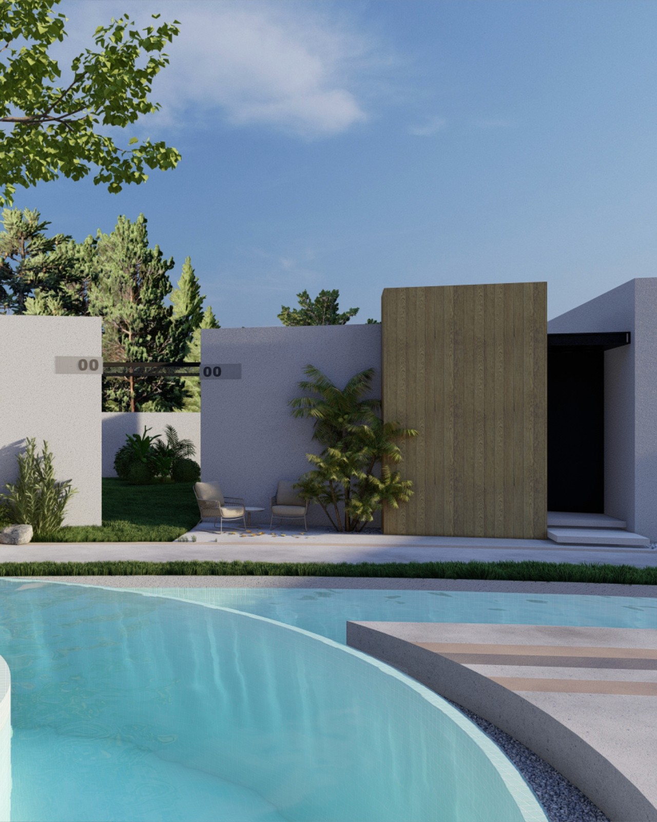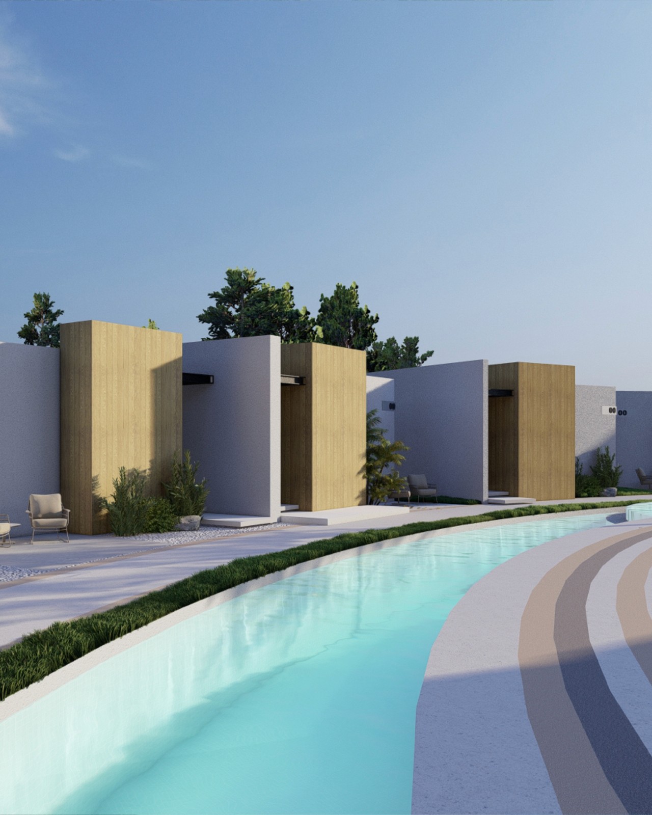 Architecturally, the units embrace clean, minimal massing and straight lines, while the surrounding curved pathways, greenery, and water elements soften the overall environment and introduce a sense of calm. Complementing the accommodation, the complex includes a dedicated reception building with separate pedestrian and private-parking entrances, along with a restaurant and a multipurpose facility—together forming a cohesive and elevated hospitality destination.