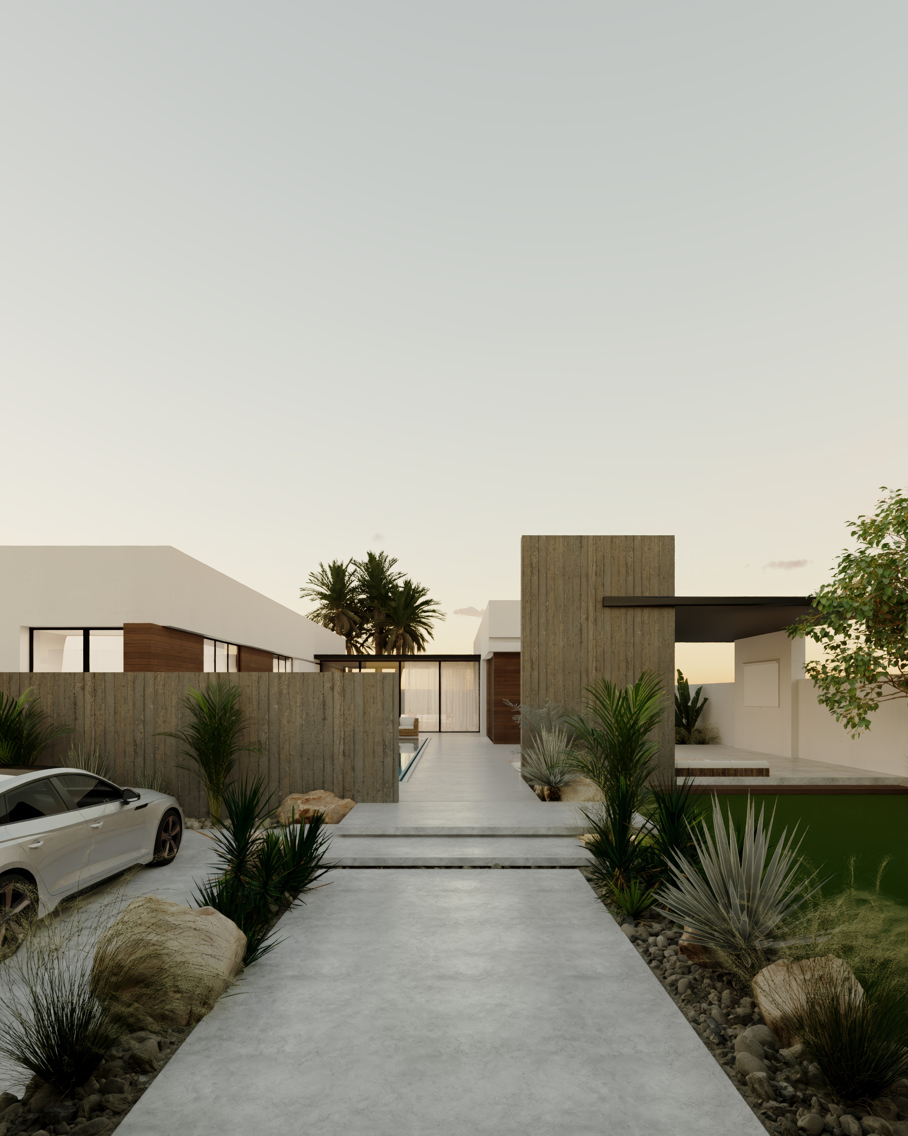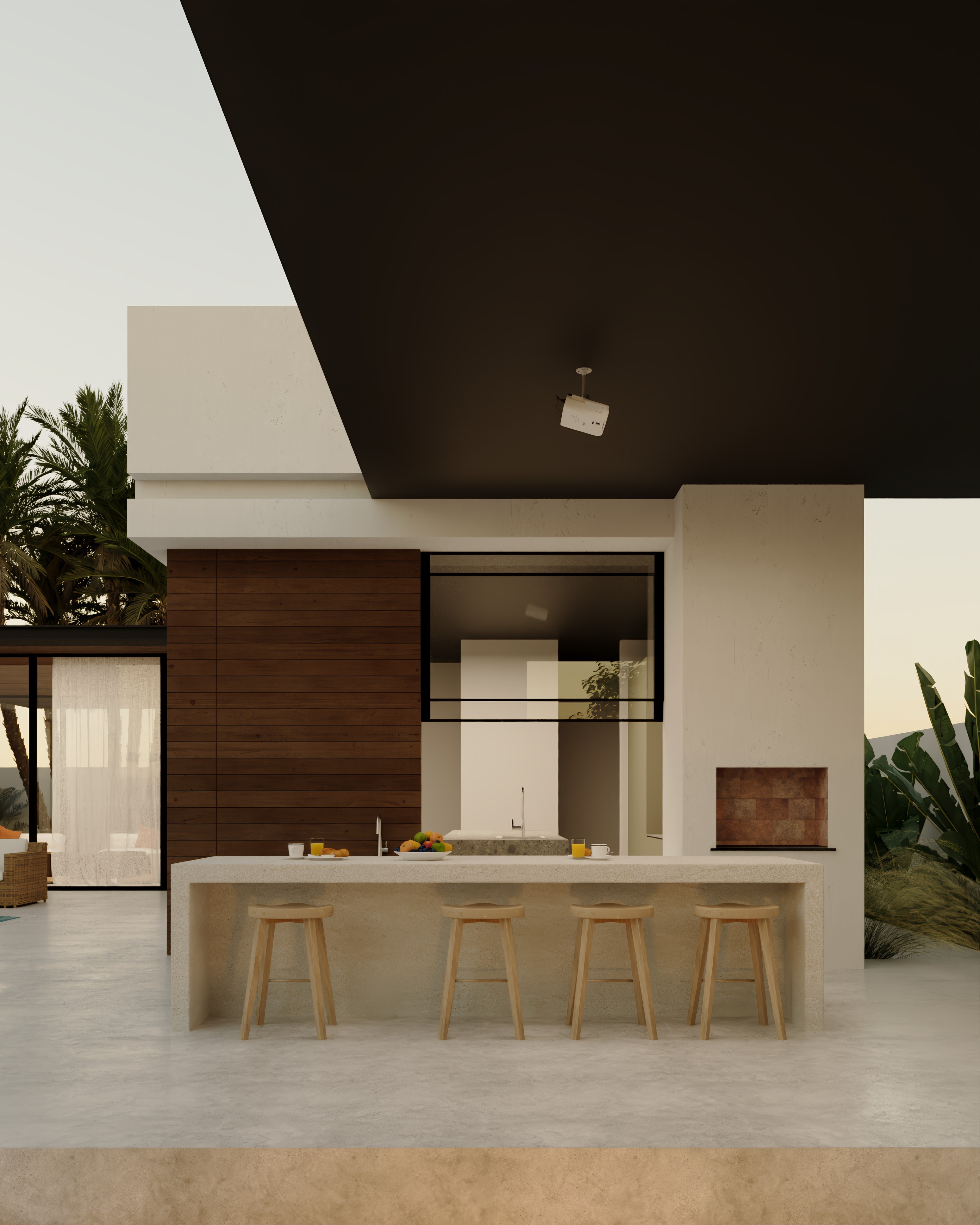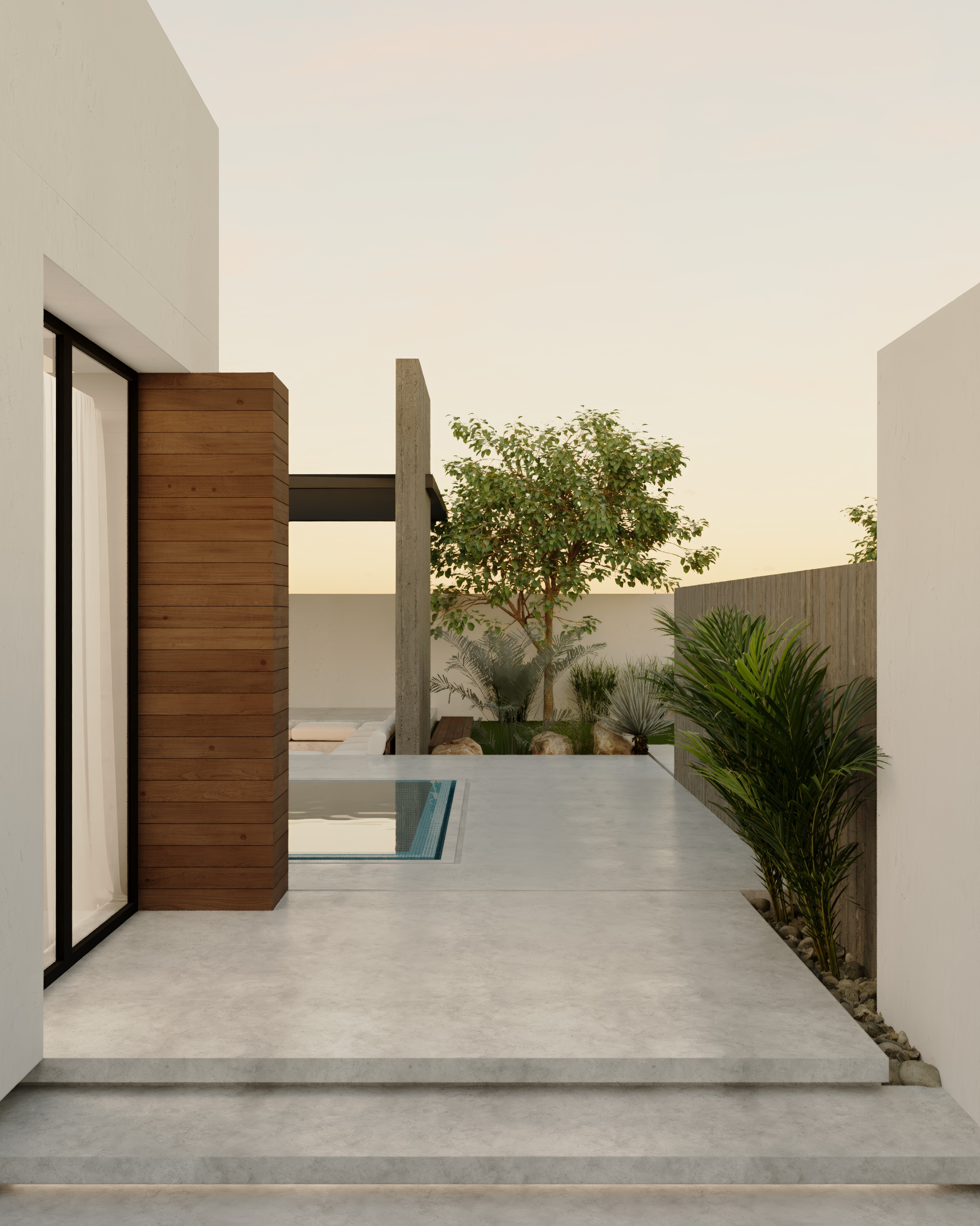 The result is a tranquil coastal retreat where modern geometry, honest materials, and nature come together—unified by the shimmering presence of the pool at the center of the design.