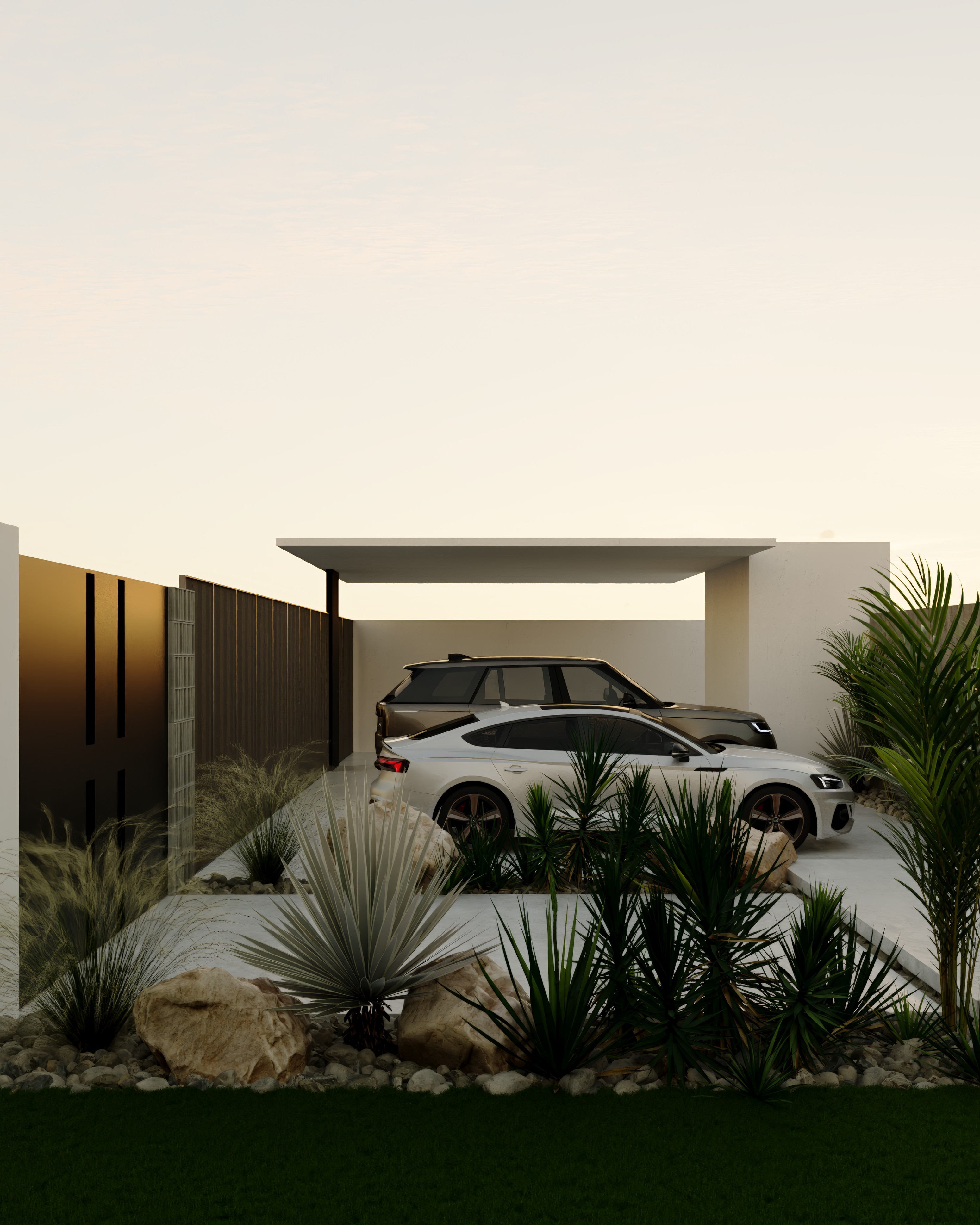 A contemporary beach house defined by clean, minimal geometry and a serene material palette. Concrete planes, steel accents, and expansive glass surfaces shape a calm, modern aesthetic, while warm wood cladding and generous windows enhance the coastal atmosphere.